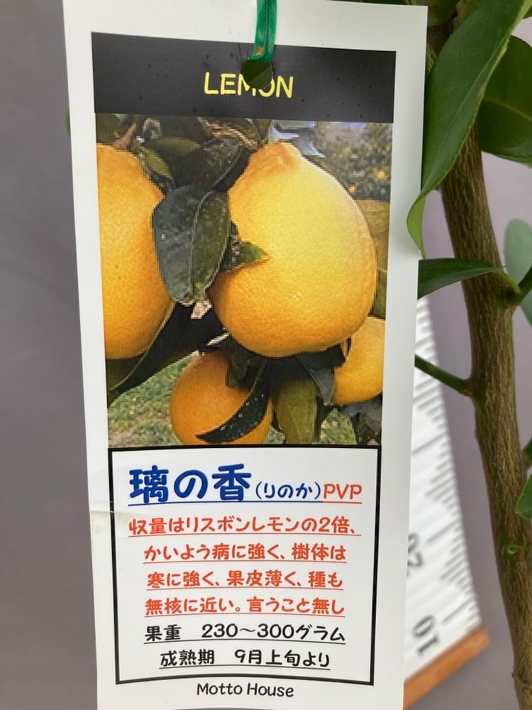 璃の香はレモンの中でも「かいよう病」に強い品種。酸味は他品種より少なく、まろやかな味わいで加工に便利!果皮も薄く手でもむくことができ、タネも少なめです。果重約200gと大玉。枝のトゲも少なく、豊産性で育てやすい。リスボンレモンと日向夏の交配品種。