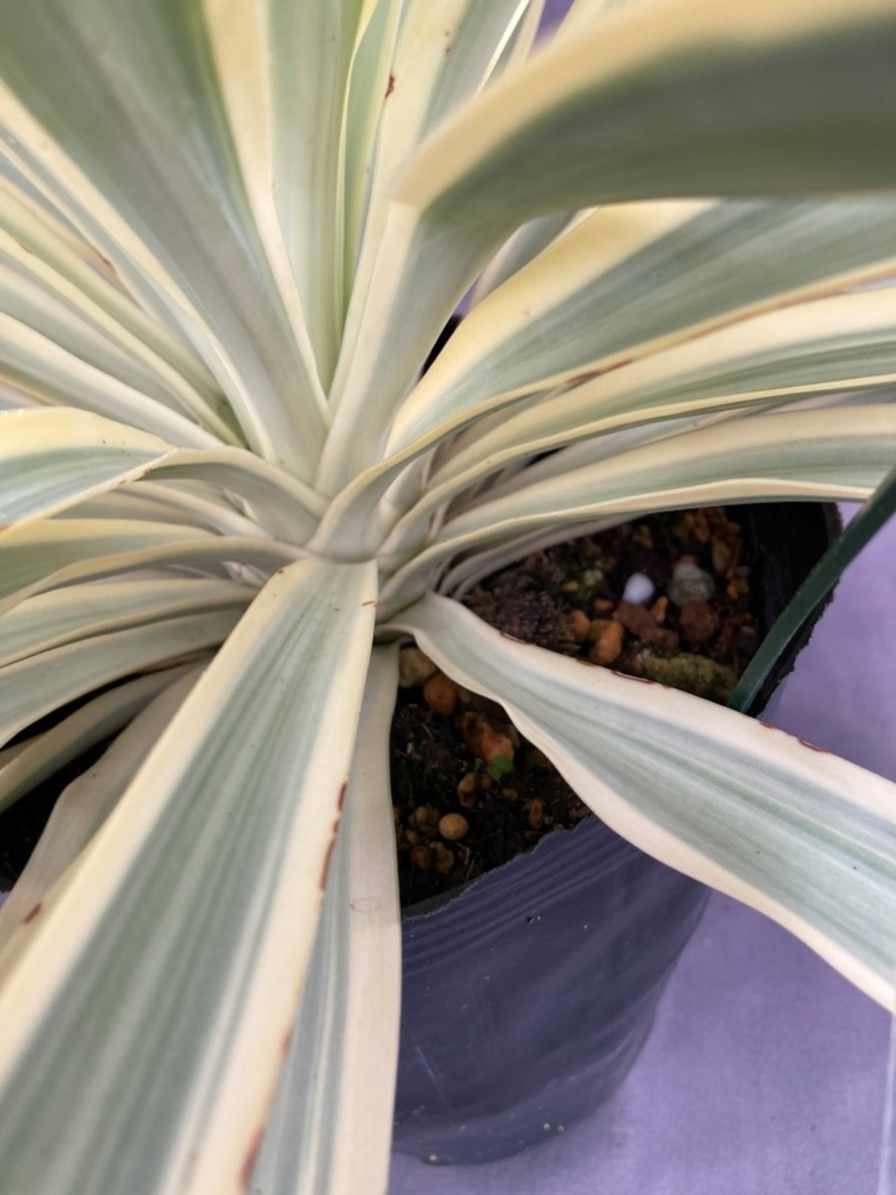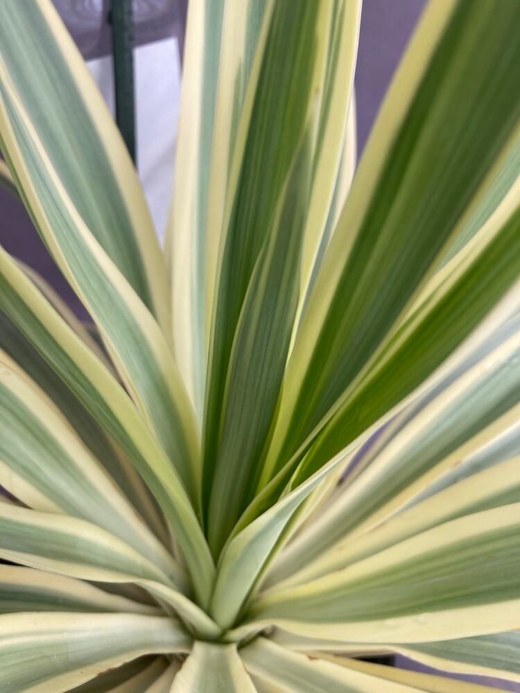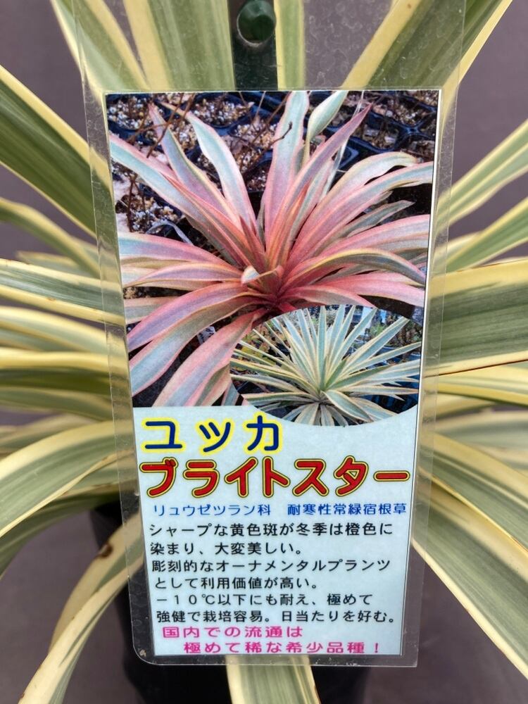 ユッカ・ブライトスターは、とてもインパクトのあるユッカです。明るいグリーンの葉の縁に幅の広い鮮やかなアイボリーイエローの斑が入り、印象的な葉色を年間を通して楽しめます。景観にとても明るい印象を与えてくれます。株が若いうちは、冬に寒さに当たると葉の縁がほんのりピンクに色づき、トリカラーのように見えます。ロックガーデンの植栽などに人気です。鉢植えで楽しむほか、玄関前などの植栽にもおすすめです。暑さ・寒さに強く、管理も容易です。高湿度は苦手なので、よく日のあたる、乾燥気味の場所で育ててください。