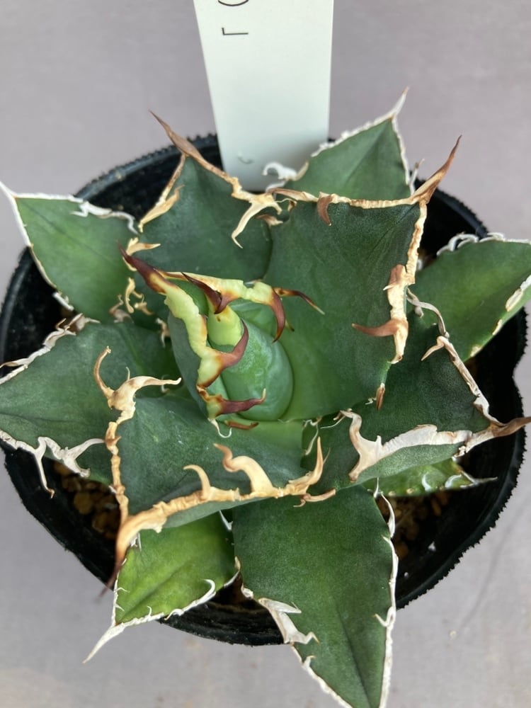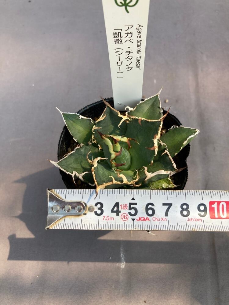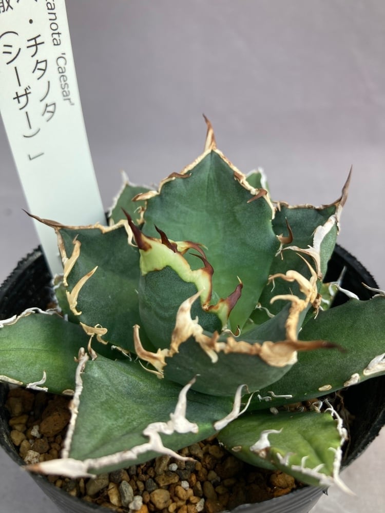 シーザー特徴の鋸歯は、他のアガベ チタノタと比較しても明らかに異なり、うねりが強く、長く連なる鋸歯が葉の縁に形成されます。この鋸歯は、育成環境によってさらに肉厚になり、葉から盛り上がるように成長するため、非常に力強い印象を与えます。