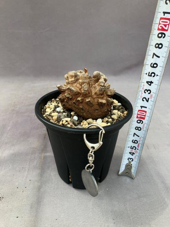 今回の販売分からプランツタグの代りにノベルティとして「長谷川亀甲竜キーホルダー」が付きます。最近人気のコーデックス・塊根(かいこん)植物としてファンを持つこの植物。名前のごとく、何十年と時を経て亀の甲羅のようなイモに育ってゆく珍しい植物です。