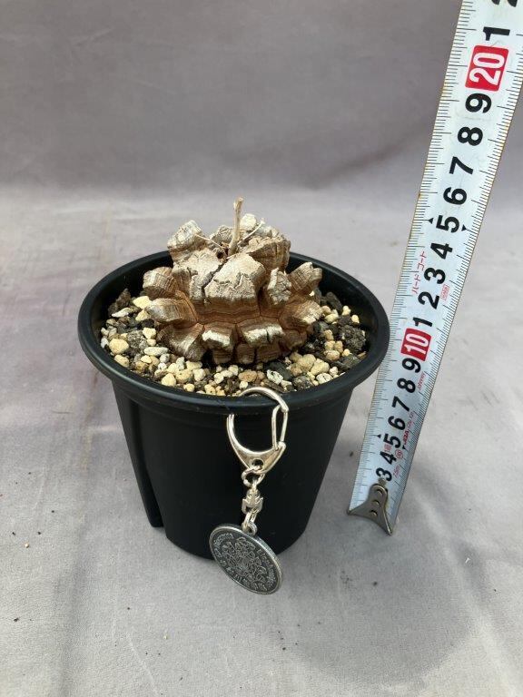 今回の販売分からプランツタグの代りにノベルティとして「長谷川亀甲竜キーホルダー」が付きます。最近人気のコーデックス・塊根(かいこん)植物としてファンを持つこの植物。名前のごとく、何十年と時を経て亀の甲羅のようなイモに育ってゆく珍しい植物です。