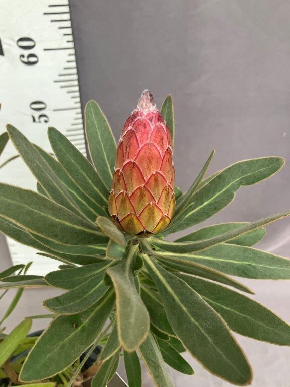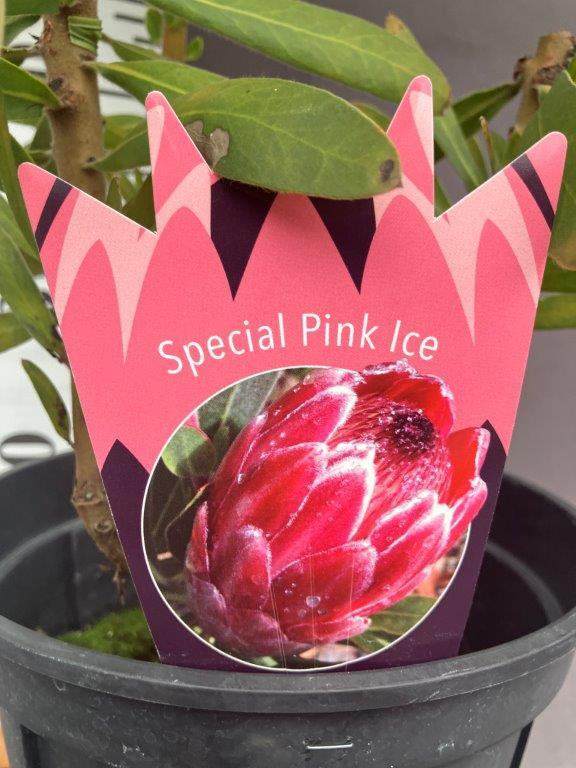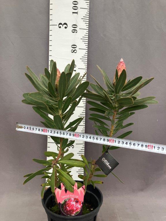 スペシャルピンクアイスは、その赤みの強いピンクの苞葉に惹きつけられます。花の中心点は黒く、霜が降ったようにふわふわの毛が花と苞葉の先端を包み込み、神秘的です。プロテア属はオーストラリアや南アフリカなどに分布する常緑低木です。多数の花が集まって頭状花序をなし、着色した総苞が美しくそれを取り囲みます。花持ちがよく切花として注目され、またドライフラワーになります。原産地は南アフリカのケープ地方で、南アフリカの国花です。