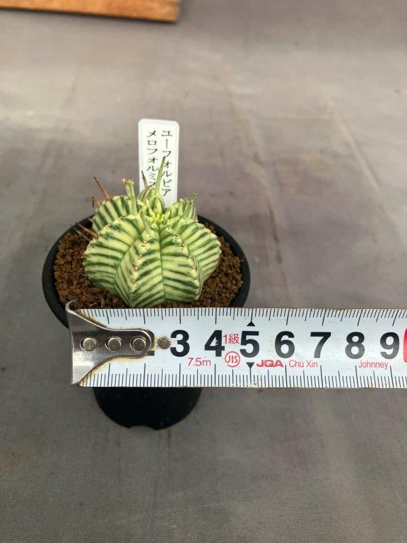ユーフォルビア・メロフォルミス錦は、丸みのあるフォルムと、クリーム色の斑入り模様が特徴の多肉植物です。その姿はメロンのようなユニークさと鑑賞価値を備え、インテリアグリーンとしても人気です。南アフリカ原産で、乾燥に強く管理がしやすい品種です。子株を周囲に出し群生しやすいため、鉢植えでも見ごたえ十分です。丈夫で暑さ寒さにも比較的強く、初心者にもおすすめです。