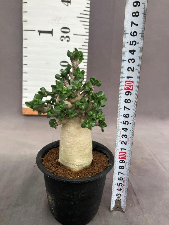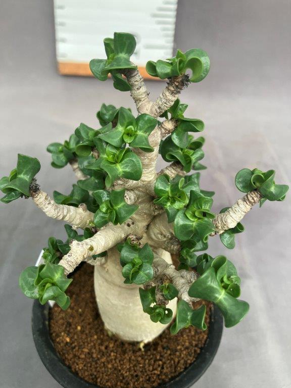 アデニウム・アラビカムの中でも葉がくるくると巻いた形状を持つ「獅子葉(巻葉)」タイプです。一般的なアラビカムに比べて葉の形状がユニークで、観賞価値が高く、塊根部のふくらみとともに盆栽のような趣を楽しむことができます。縦に伸びる性質が控えめで、コンパクトな樹形を保ちやすいのも魅力です。