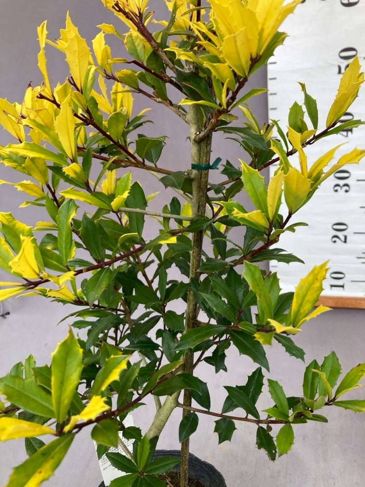 春の新芽が黄色葉のあかるいヒイラギです。春の目立ちから黄金色で、夏の光を受けてメタリックなグリーンカラーとなります。夏には緑になり、夏には緑になり、冬には赤い実がつく場合もあります(実はつきにくい品種です)。秋に伸びた枝も冬は黄色を残しているので、とてもカラフル。葉のトゲはごく小型です。刈り込みに耐えるので、生垣用におすすめです。日本のヒイラギと異なり、モチノキ科の常緑中高木です。