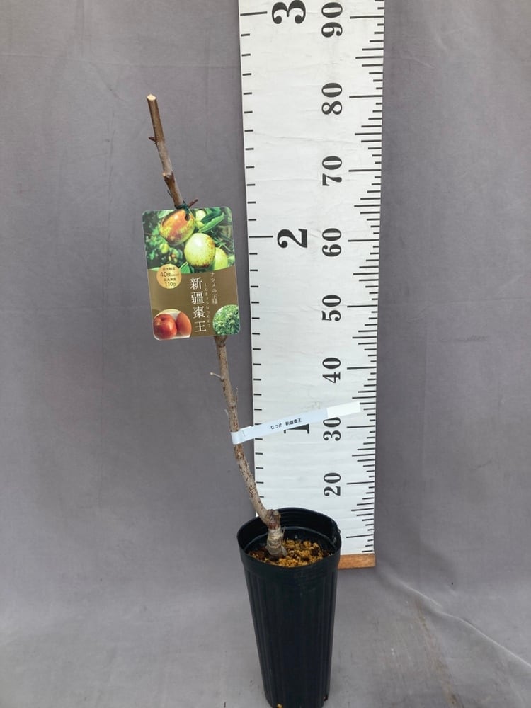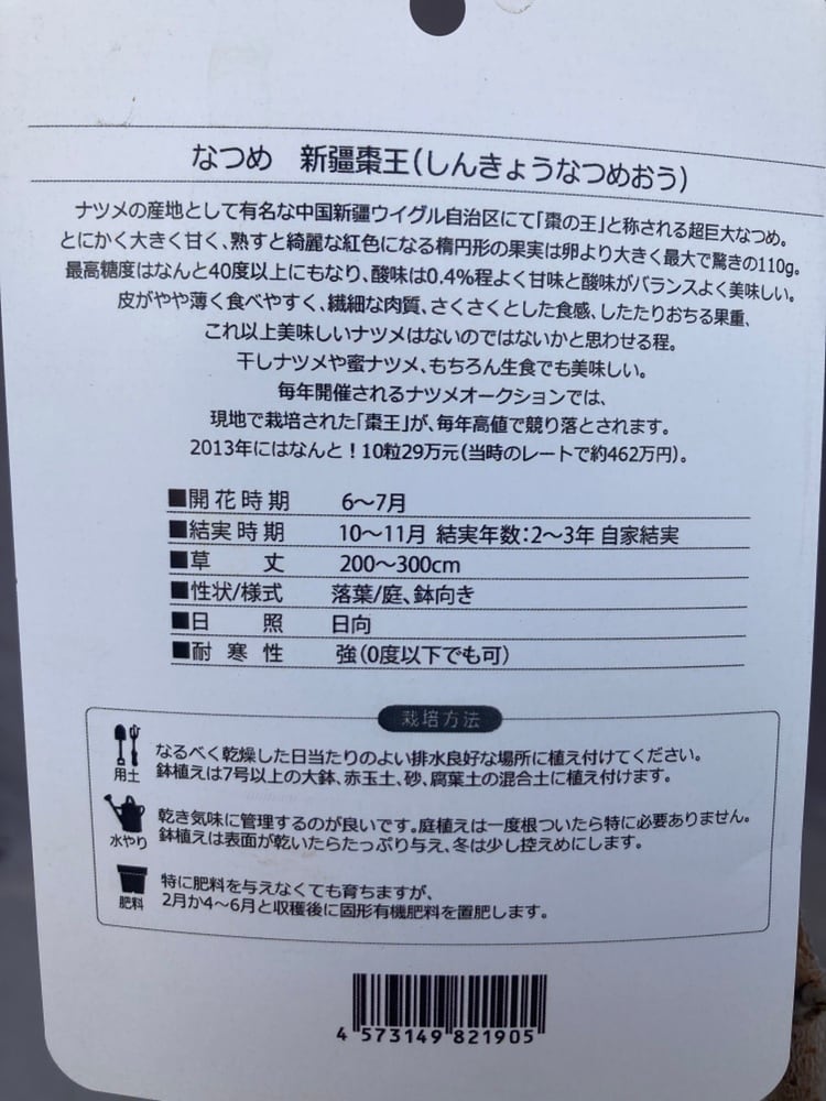 新疆棗王(シンキョウナツメオウ)は、ナツメの王様と称されるほど超巨大な実を付けます。卵よりも大きい紅色の実は100gを超えることも。糖度も最大40度と群を抜いて甘く、皮は薄く繊細な肉質、サクサクとした食感で生食でも美味しくいただけます。もちろん、干しナツメなどの加工用にも最適です。しっかり熟したほうが美味しくなるので、果実が茶色くなるまで待つのが理想です。