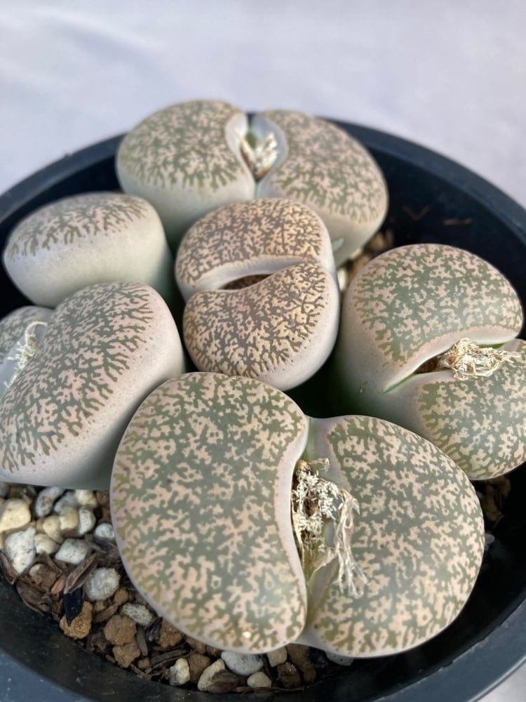 リトープス(Lithops)は多肉質のユニークな形の宿根性多肉植物です。外敵から身を隠すために自らが小石に似せた姿になっているので、小石(ペブル)のような植物とも呼ばれます。脱皮をする植物としても有名で、珍しい植物です。大きくはメセン類と呼びますが非常に変異しやすく多種多様であり品種の特定が難しい植物群です。大部分は南アフリカ原産のもので、その気候のため生育期と休眠期があります。花は主に黄色系で赤系のものもあります。中心の割れ目からマツバギクのようなかわいらしい花を咲かせます。。
