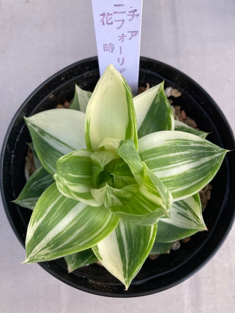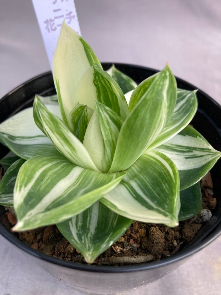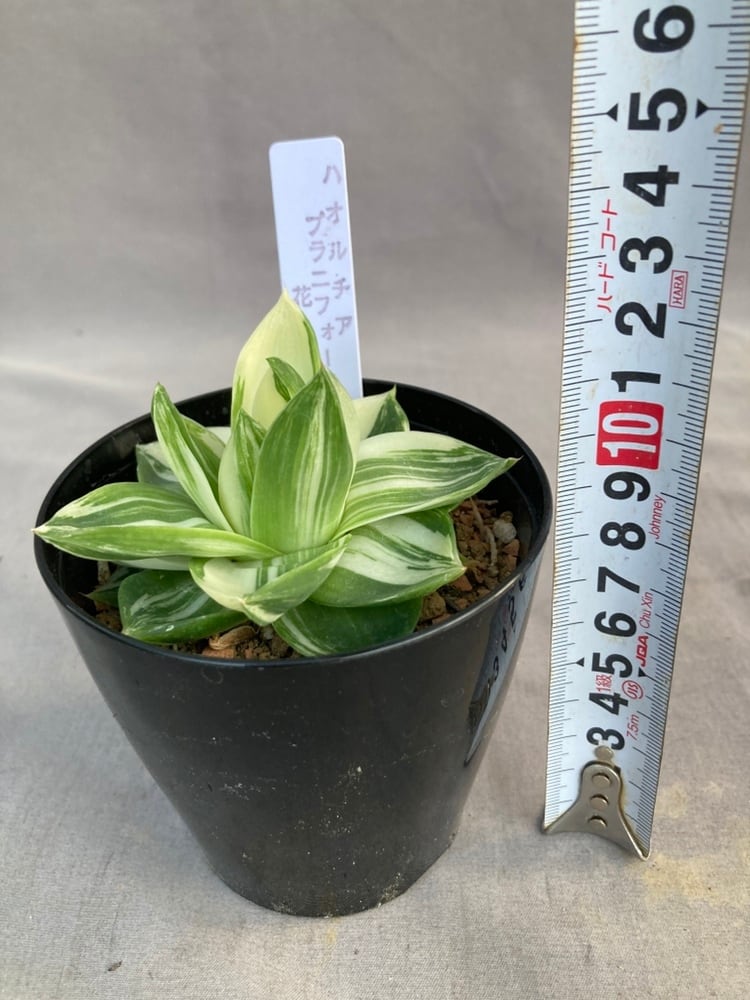 刷毛で入れたような美しい斑のハオルチア プラニフォリア花時計です。流通量は非常に少ないです。ハオルチアはぷにぷにとした姿のかわいい多肉植物。南アフリカのケープ地方などに自生する多肉植物の仲間です。多肉植物の中では最も小型で強健な種が多いのが特徴です。色や形は多種多様ですが、いずれの品種も乾燥に強く、耐陰性もあるので、室内での栽培にも向いています。
