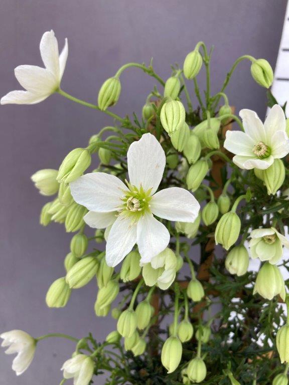 カルトマニージョーはオーストラリア原産のクレマチスから生まれた園芸品種。常緑性です。春先に緑がかったクリームイエローの花をたくさん咲かせます。つるが伸びない木立ち性で乾燥にも強く、鉢花として楽しむことができます。