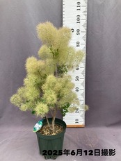 ヤングレディーはスモークツリーの中でも特に小型ながら、たいへん花付きの良い品種です。花は最初は淡緑でその後、白~美しいパステルピンクへと変化していきます。その美しさはまさに幻想的です。葉は明るい緑で、秋には美しく紅葉します。花と葉のどちらも楽しめるスモークツリーです。花壇や庭木のみでなく、コンテナや鉢植え、切花、ドライフラワーにも向いています。