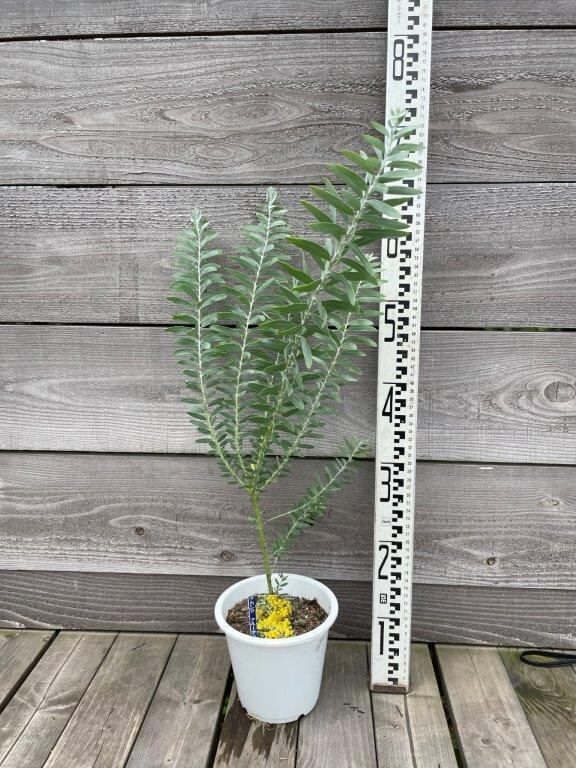 ブルーブッシュはシルバーブルーの葉色がとても美しい品種。成長すると、高さは5mを超えることもあり、家のシンボルツリーにもよく活用されている品種です。美しいシルバーブルーの羽のような柔らかい葉と、3月くらいに咲く黄色の球状をしたふわっとした花との共演はまさに圧巻。日本でも人気の高いアカシアの一種です。