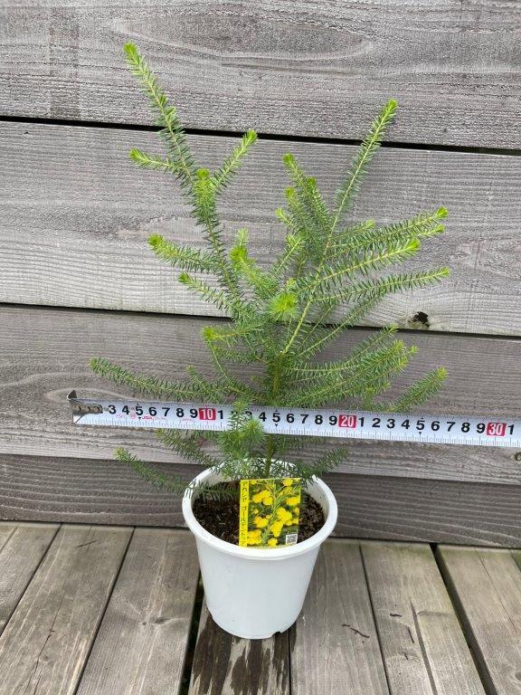 アカシアのなかでも成長が遅く、小型で樹形が株立ち状となるタイプです。樹高30~40cmから開花し始めるので、狭いスペースでも花が楽しめます。葉はごく小型の三角葉、花は黄色で3月頃に開花します。丸い株全体を覆うように花が咲きます。