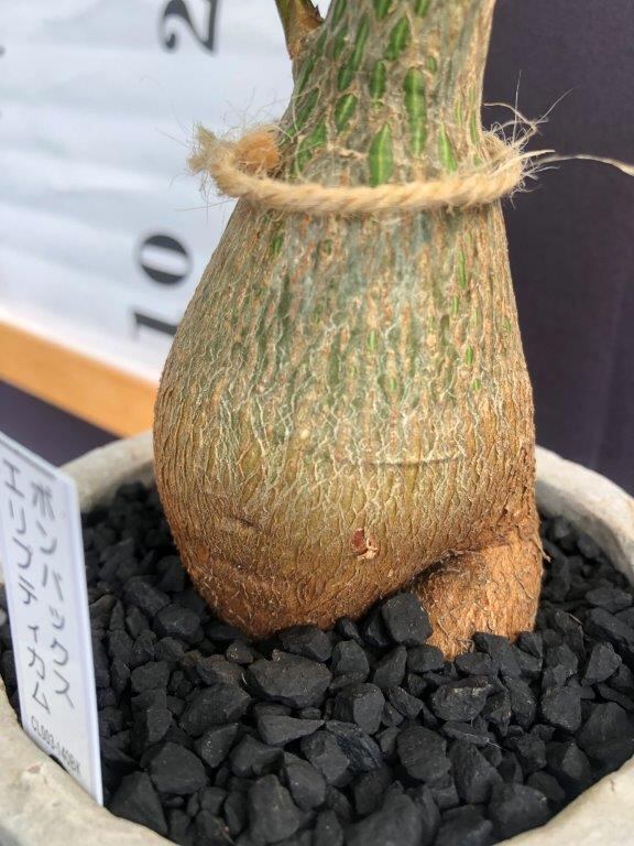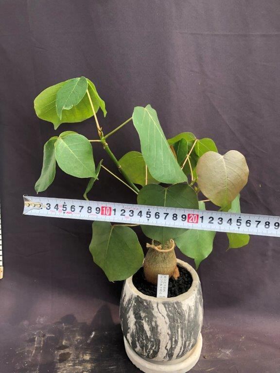 ボンバックスは中米、インドなどに分布する灌木で、グアテマラの国樹として知られています。性質はパキラに似ていますが、葉が幅広で根元の茎が肥大して塊根状になります。年数を経ると茎の下部が木質化して味わいのある姿になります。冬に葉を落としますが、春になるとまた美しい新芽を吹きます。おしゃれな陶器鉢に入ってますのでそのまま飾れます。