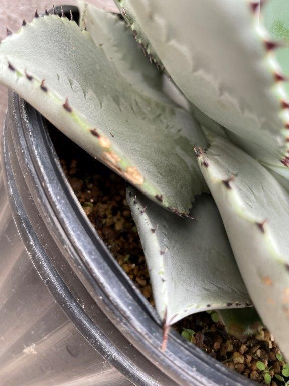 アガベはリュウゼツランと同じアガベ属の多年草で、品種は数百種あり、一部は繊維やテキーラの材料として利用されています。耐寒性の高い品種が多く、欧米や日本で観葉植物として利用されています。ブルーウェーブは「コロラータ」と「セルシーノヴァ」のハイブリッド種です。明るいブルーの葉が美しく、葉はウェーブ状になるのが特徴です。