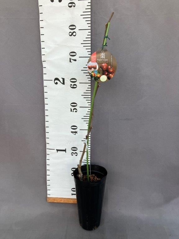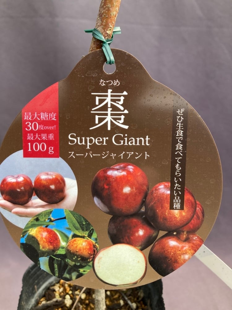 スーパージャイアントの大きさは、ナツメ種の中でタマゴより大きい、一番の巨大果。超ビッグで果重は50~100gにも達し、最高糖度は糖度計30度以上にもなり、果樹の中での最高レベルの甘さとなります。リンゴに似た触感で糖度も高く食べ応えのある実と健康効果で「食べる薬」として大人気で、ビタミンCはなんとリンゴの100倍も!!(正式名は大雪ナツメ)