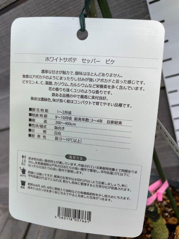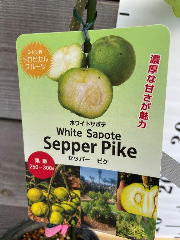 ホワイトサポテはメキシコ原産のトロピカルフルーツ。「メキシカンアップル」と呼ばれることもあります。濃厚な甘さが魅力で、酸味はほとんどありません。なめらかな果肉はまったりとした食感で、甘みが強いアボカドといった感じです。また、味は洋梨やマンゴー、バナナなどを混ぜ合わせたような非常に甘くておいしいフルーツです。ビタミンA、C、葉酸、カリウム、カルシウムなど栄養素も豊富です。花も香りが強く百合のような香り。光沢があるアケビのような葉は観葉植物としても雰囲気があります。自家結実性がありますが、異なる品種を混植するのがおすすめです。耐寒性は成木になると-5℃くらいまで耐えるとされていますが、幼木のうちは寒さに当たらないように管理してください。