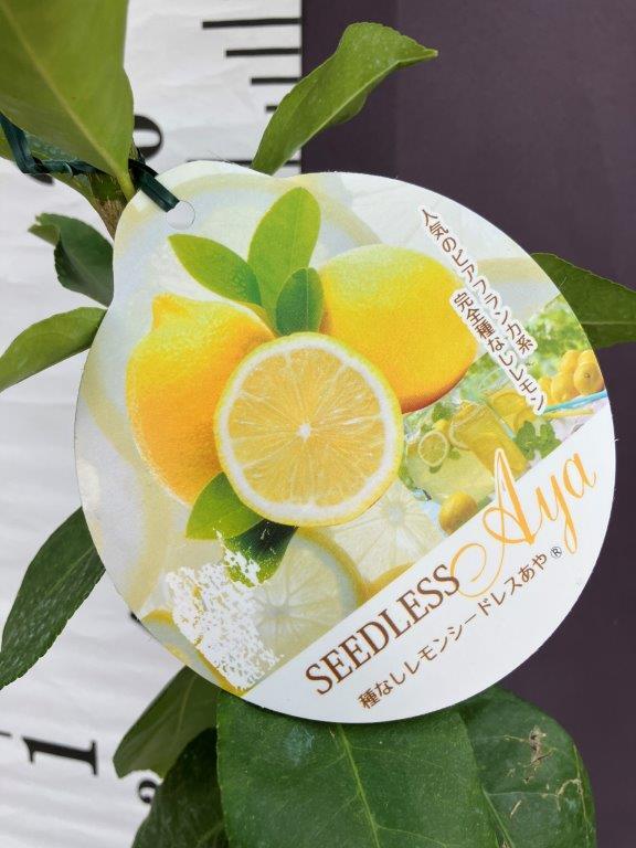 シードレスあやは人気のビアフランカ系の完全種なしレモンで、他の柑橘類の花粉の影響を受けず、種ができない品種です。ビアフランカを親に福岡県で作出され、親の性質を受け継いでトゲが非常に短小で少なく、丈夫で栽培しやすいのも特徴です。最大果重は約130g。自家結実性で1本で実をつけます。