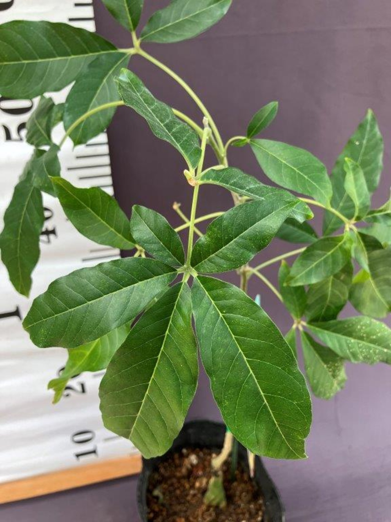 ホワイトサポテはメキシコ原産のトロピカルフルーツ。「メキシカンアップル」と呼ばれることもあります。濃厚な甘さが魅力で、酸味はほとんどありません。なめらかな果肉はまったりとした食感で、甘みが強いアボカドといった感じです。また、味は洋梨やマンゴー、バナナなどを混ぜ合わせたような非常に甘くておいしいフルーツです。ビタミンA、C、葉酸、カリウム、カルシウムなど栄養素も豊富です。花も香りが強く百合のような香り。光沢があるアケビのような葉は観葉植物としても雰囲気があります。自家結実性がありますが、異なる品種を混植するのがおすすめです。耐寒性は成木になると-5℃くらいまで耐えるとされていますが、幼木のうちは寒さに当たらないように管理してください。
