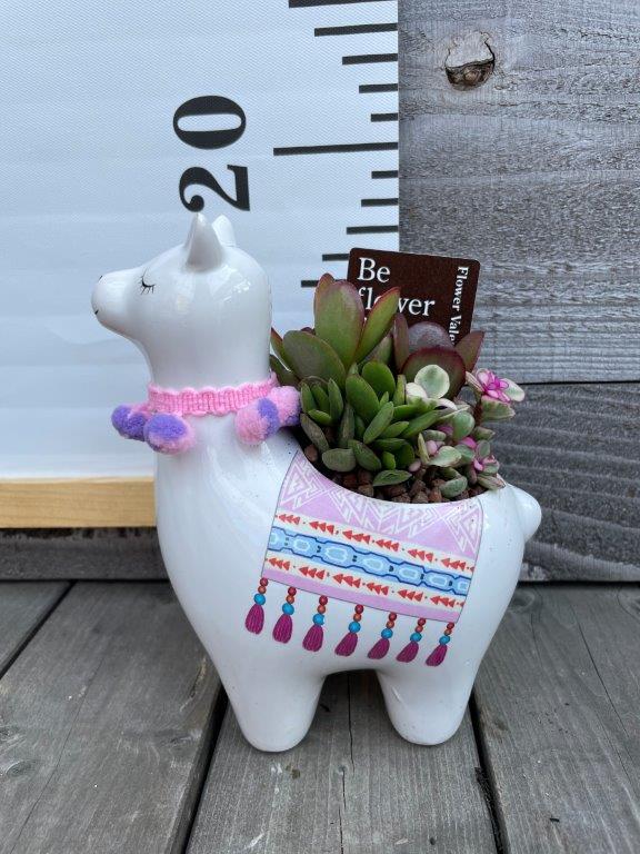 かわいいアルパカの陶器鉢に多肉植物が寄せ植えしてあります。室内のインテリアにどうぞ♪