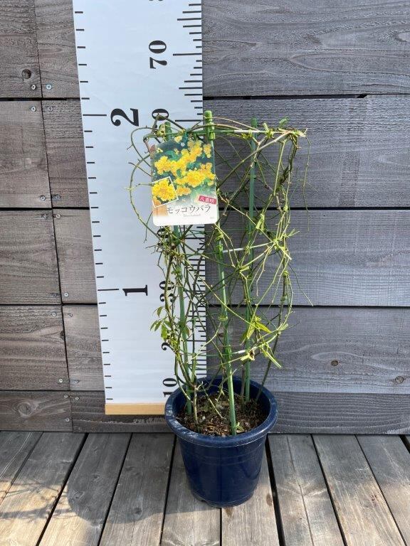 モッコウバラは春に花径約2センチのかわいい八重咲きの花を房状に10数輪づつ咲かせます。とげがないつるバラで強健なので、初めての方にも育てやすい品種。モッコウバラは12月に花芽ができるので、他のつるばらと異なり、冬の剪定は行いません。枝が伸びすぎて困る場合は、7月はじめ頃に剪定してください。パーゴラやアーチ、壁に這わせたり、生垣にも向きます。