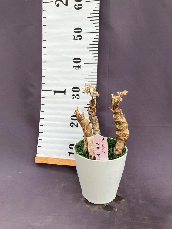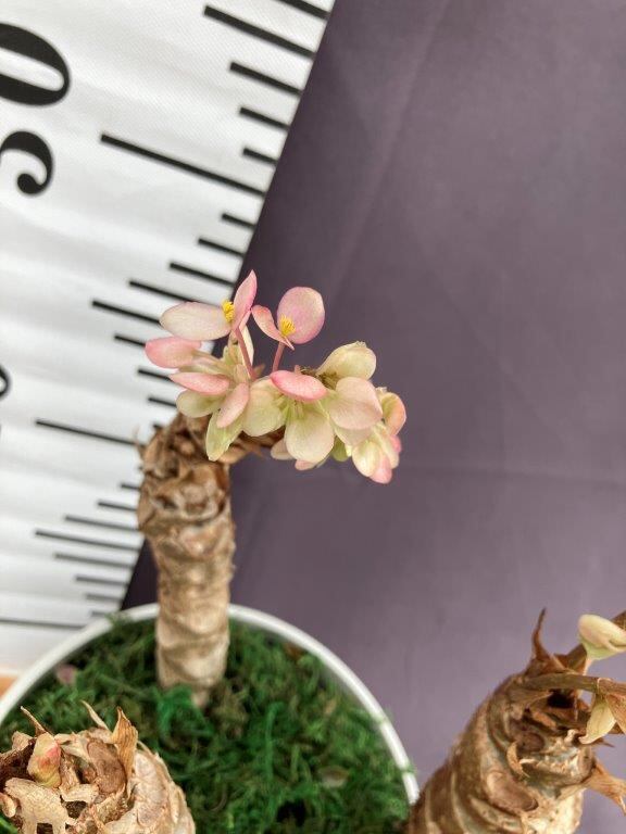 さくらベゴニアとも呼ばれる根茎性ベゴニア クラシカウリス。南米グアテマラ原産のベゴニアで1842年に発見されました。山葵のような形の根茎からさくら色の花が先に咲いて、後から葉で出てくる珍しいベゴニアです。晩秋には葉が落ち、根茎のみの姿になりますが、早春から花が咲き始めます。ユニークな株姿が人気で塊根植物同様に株そのものを鑑賞します。夏場は日陰においてください。暑さにはめっぽう強いですが、寒さにやや弱いので、冬場は室内で管理すると良いでしょう。