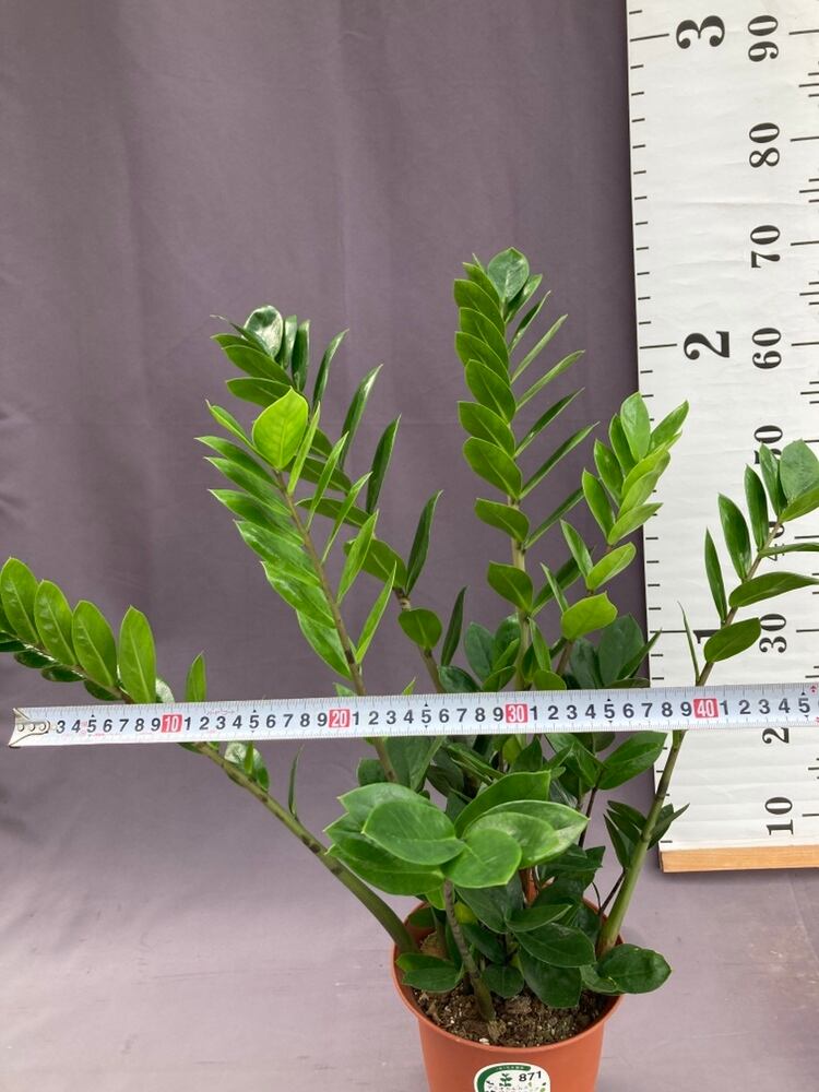 ザミオクルカスはアフリカ東部原産で、つやつやで、やや多肉の葉がきれいに並び、ピンと伸びている姿が美しい観葉植物です。インテリアは和風でも洋風でも合う優れものです。葉と根に水を蓄えるため乾燥に強く、水の遣り過ぎは根腐れを起こしますので、鉢土の表面が乾いてから水遣りをする様に気を付けて下さい。