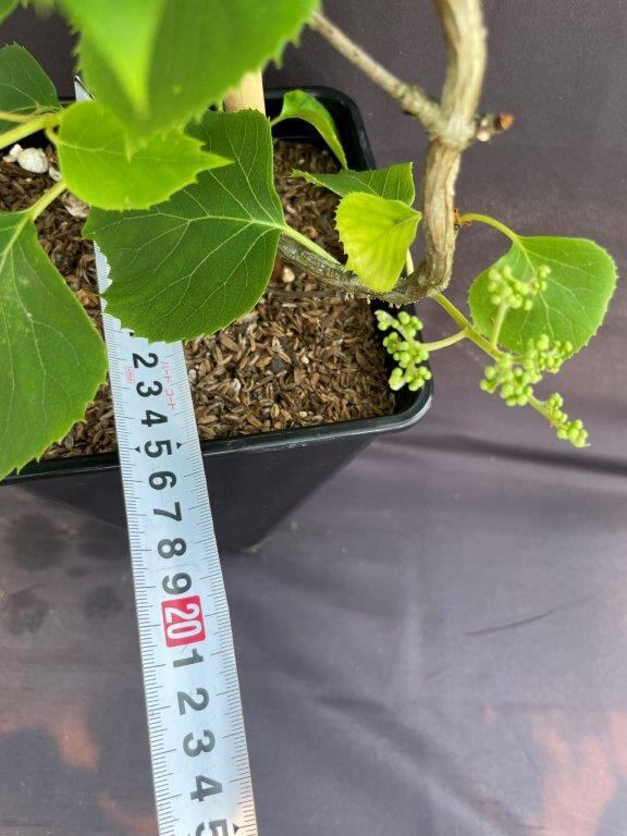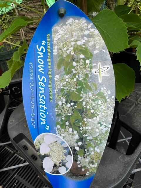 ツタのように木や壁面を這い上がる、つる性のアジサイ科の仲間で、従来種に比べて旺盛で非常に花付きの良い品種です。初夏にガクアジサイに似た純白の装飾花を咲かせます。壁やフェンスなどに這わしたり、緑のカーテンに向いていますが、仕立てをすることで鉢栽培も可能です。耐寒性に優れていますが落葉樹です。日向~やや半日陰で育ててください。