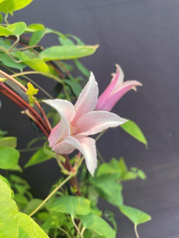 クレマチス・琴子は、テキセンシス系の代名詞ともなっているプリンセスダイアナの枝変わり品種。やさしい色合いとピンクと白のツートンカラーが特徴です。つるが2m以上伸びてから花が咲くので、フェンスやオベリスク等に絡ませて咲かせるのがおすすめです。花後の夏時期の剪定(切り戻し)は、春から伸びたつるの半分くらいで行うと、秋に再び花を咲かせます。