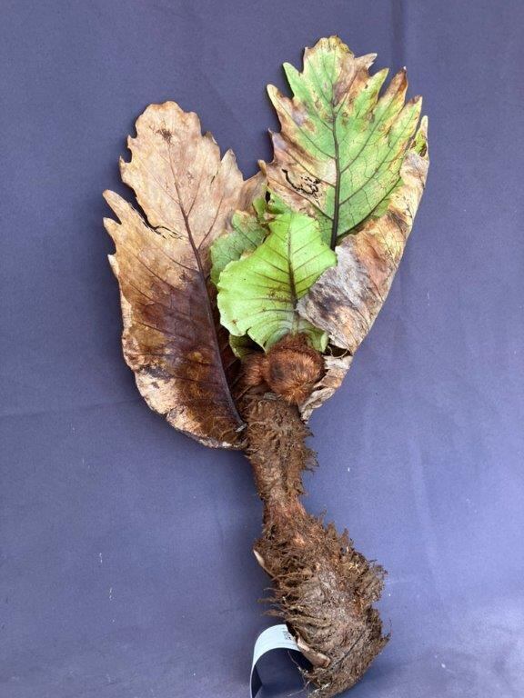 ドリナリア・クエルキフォリアは、インド・中国南部・オーストラリア原産で、ビカクシダと同じ着生のシダ植物です。個性的な樹形であまり流通の少ない珍しい植物です。シールドと呼ばれる葉(泥除け葉)は成長し茶色くなりますが貯水の役割があるためカットせずそのままにしてください。