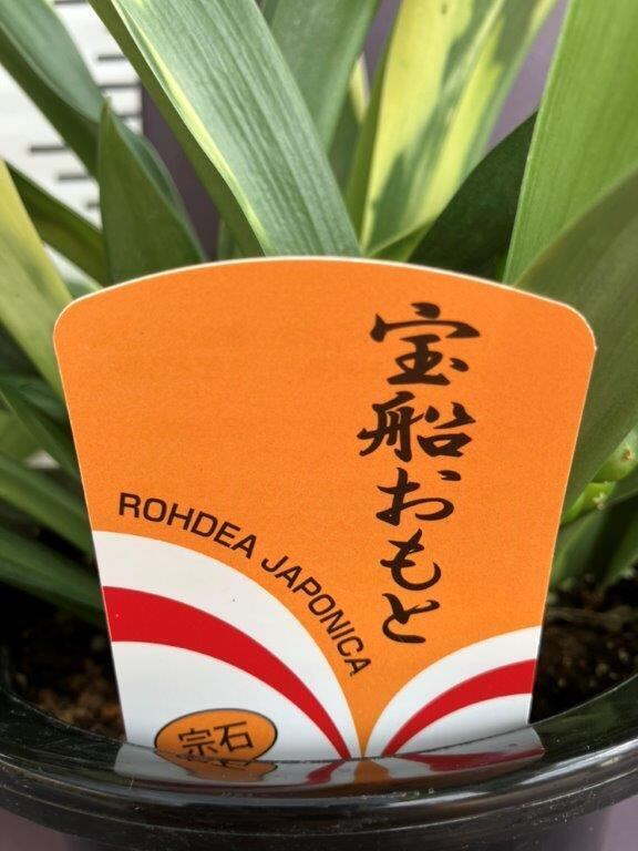 万年青(オモト)は縁起がいい植物で人気があります。5~7月頃に淡いクリーム色の小さな花を円筒状に密生させ、そのあと艶のある赤い実を付けます。宝船は、白~クリーム色の美しい斑を出し時がたつと徐々に緑葉に戻る人気の品種です。