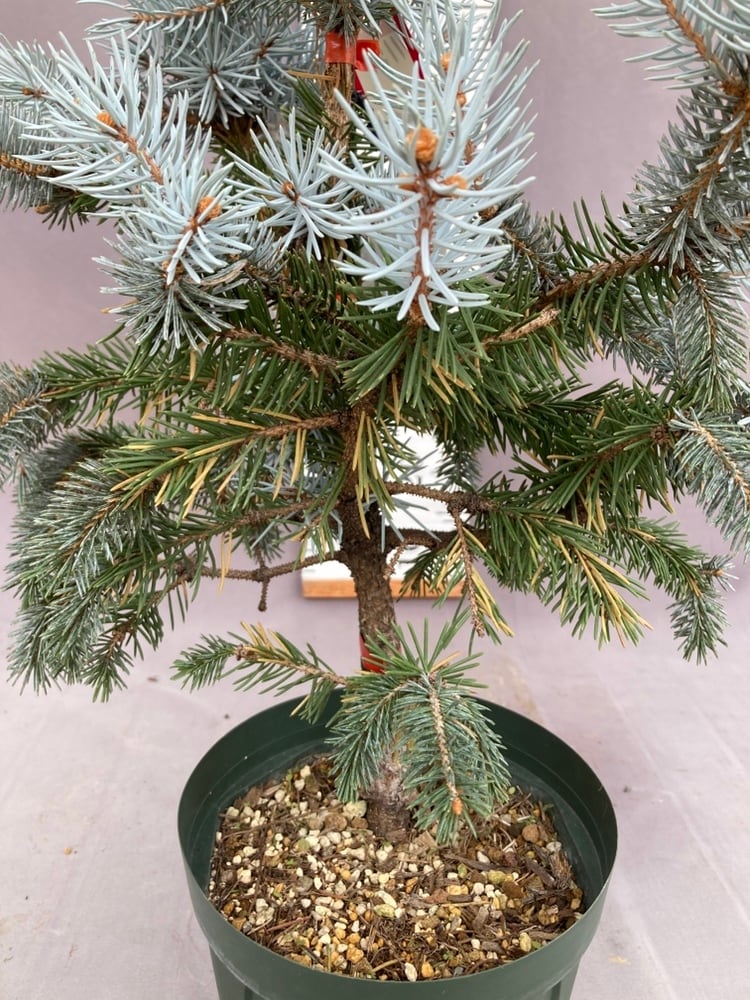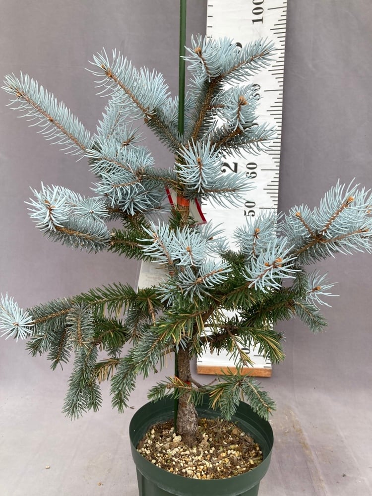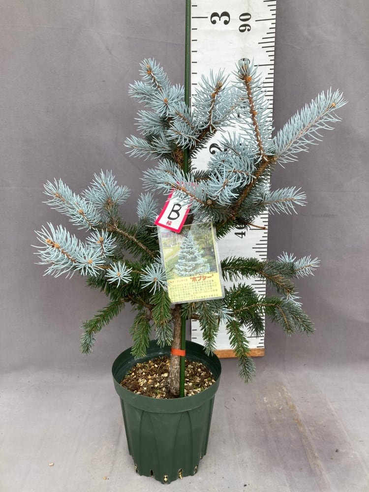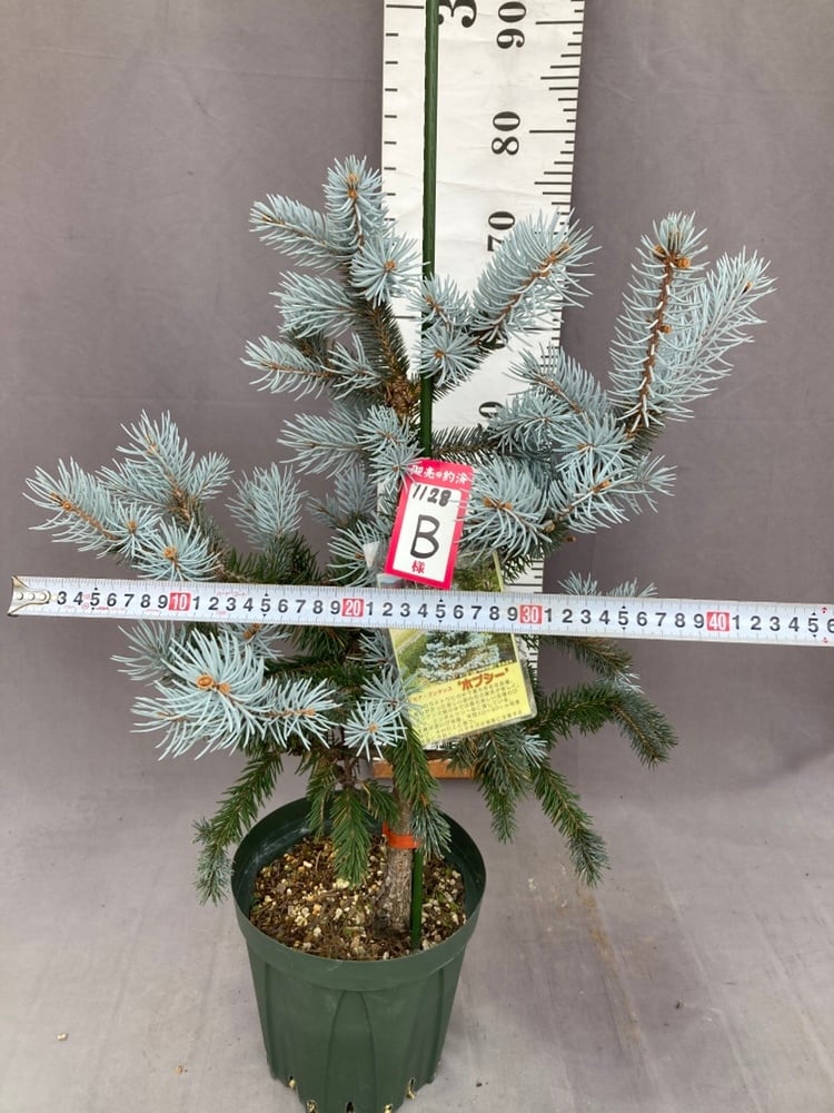 現品1128B商品です!ピセア・プンゲンス・ホプシーは、他では見られないまぶしいほどの銀白色が特徴で、コニファーの中でも王者の風格漂う人気品種。これからのクリスマスのシンボルツリーなどとして垂涎の的です。ほかにも多数の品種があるが、生産・流通ともに少なくとても希少品種です。モミ類と異なり暑さにも比較的耐えるが、暖地ほどシンクイムシの食害を受けやすいので注意する。