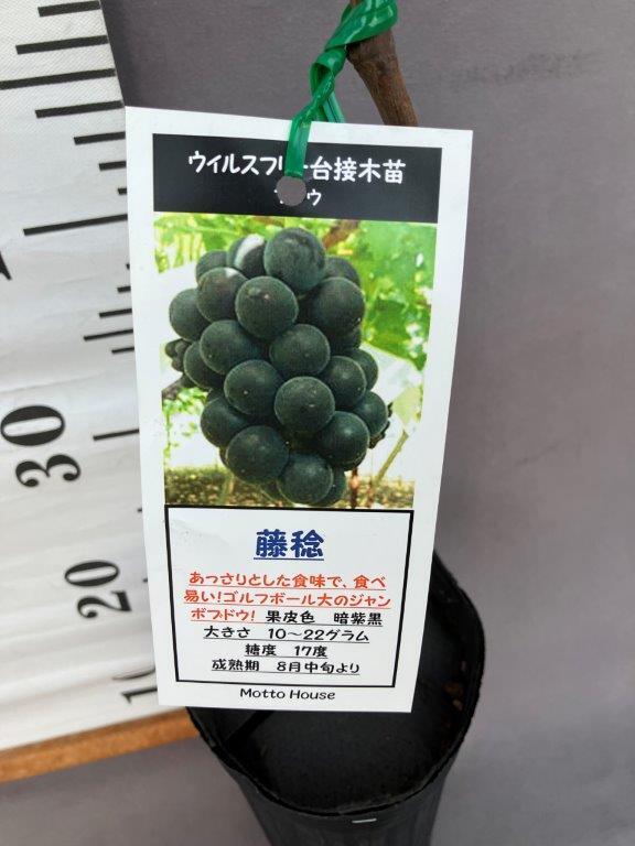 藤稔は、ゴルフボール大にもなる果実の大きさが特徴。あっさりとした味わいで、スーパーには並ぶことが少なく、直売所などで高い人気がある品種です。耐病性強く、樹勢強く生育旺盛で育てやすい。ぶどうは自家結実性があるので1本でも成ります。