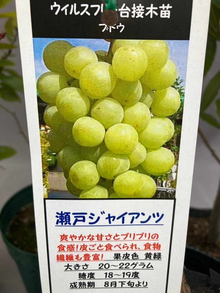 瀬戸ジャイアンツは爽やかな甘さとプリプリの食感で皮ごと食べられ、食物繊維も豊富なブドウです。果肉が柔らかく多汁、糖度も高めの超大粒品種。岡山県で多く生産されており「桃太郎ぶどう」と呼ばれるのもこの品種です。皮ごと食べられるぶどうブームの先駆けとして、現在のシャインマスカットに繋げています。