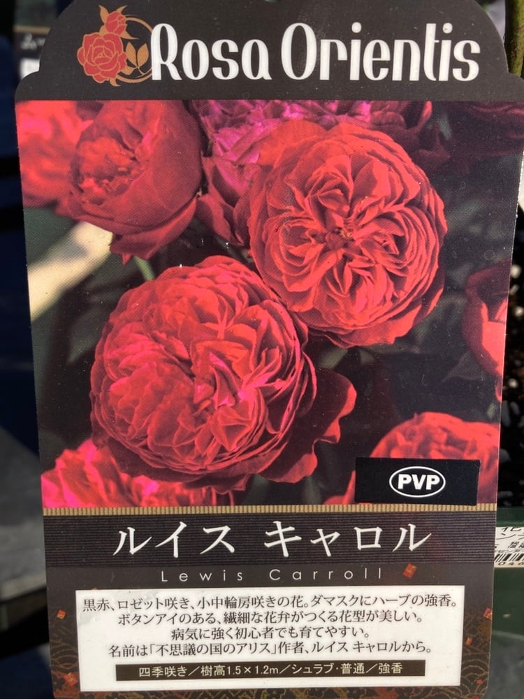 黒赤のロゼット咲きで小中輪房咲きの花。ダマスクにハーブの強香。ボタンアイのある、繊細な花弁がつくる花形が美しい。病気に強く初心者でも育てやすい。名前は『不思議の国のアリス』作者、ルイス・キャロルから。