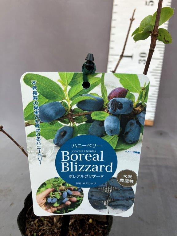大実のブリザード。ポリフェノールを多く含み、さらにカルシウム、鉄分、ビタミンも豊富に含むため不老長寿の果実とも呼ばれるハニーベリー(別名ハスカップ)。日本種とヨーロッパ種のハイブリッドで従来の大実タイプより大きく甘みもあり豊産性といいとこづくめです。自家結実性が低いため、異品種を混植するのがおすすめです。
