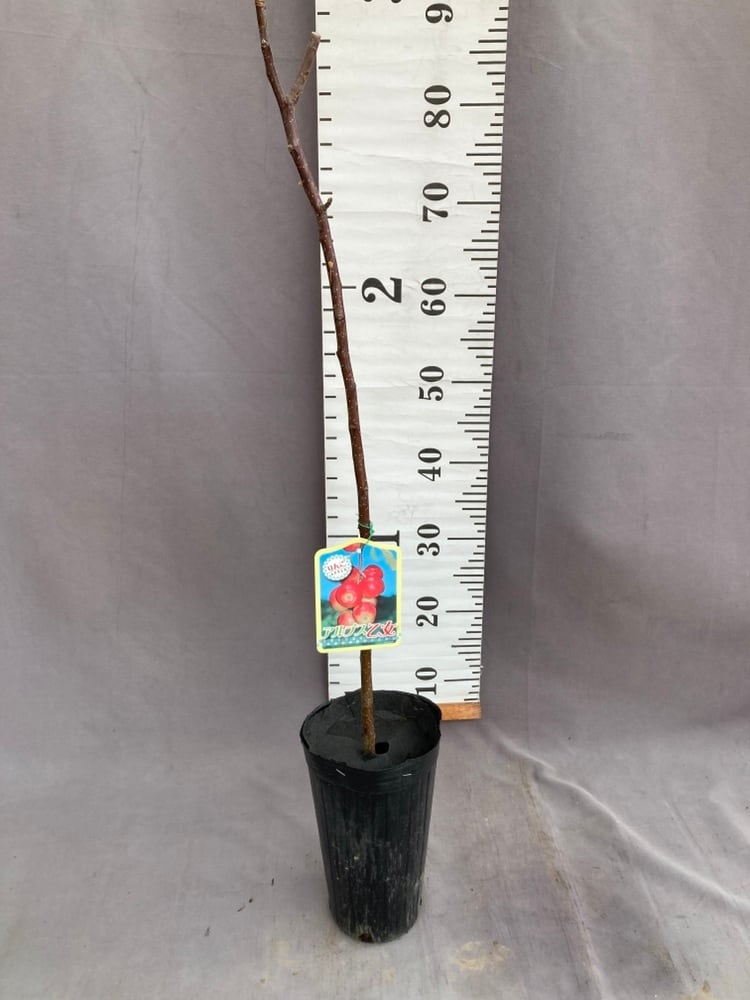ミニリンゴでは一番人気のアルプス乙女。実は直径4cm、1個25〜30gと小型ですが、人気品種「ふじ」から生まれた品種なので、糖度が15度とさわやかな甘味でおいしいリンゴです。豊産性で、真赤な実が鈴なりになったところは観賞価値も高く、食用としてだけでなく、庭木や鉢植えにもおすすめ。一本でも実がなります。