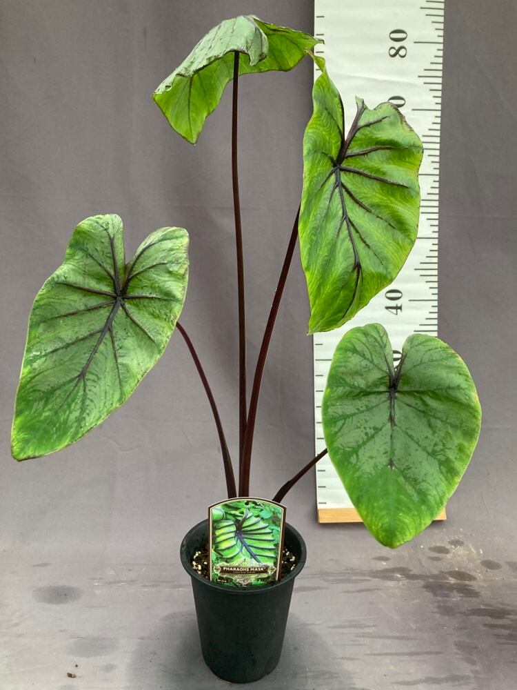 コロカシア・ファラオマスクは、サトイモの仲間コロカシアの園芸品種です。市場には滅多に現れないとても希少な品種です。黄緑色の葉と黒い葉脈・幹のコントラストが格好良く、エキゾチックな雰囲気をたっぷり味わえます。