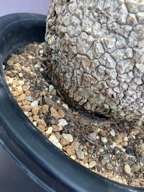 現品販売のステファニア・スベローサは、東南アジア原産の塊根植物(コーデックス)です。根元の巨大な木質状の塊根が特徴的ですが、原産地では薄暗い熱帯雨林の林床などに自生し、根は地中に埋まっています。鉢植えで観賞するものは、根を地上に出して植えてあります。夏に塊根から太い緑色のツルを伸ばし、ハスのような丸い葉を展開しながら成長します。自生地では薬用植物としても利用されています。
