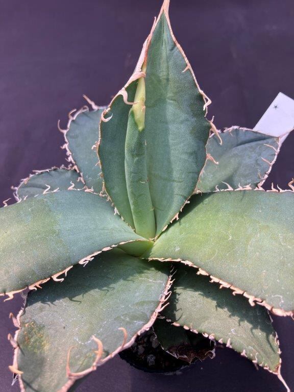 現品販売です。チタノタは、アガベ全般に言えるがロゼットを形成し、他のアガベよりも肉厚で鋸歯が大きく独特。成長は比較的早く子株を多くつける場合があるが、大きくなっても直径30〜60cm程度でコンパクトにまとまりやすくベランダなどで育てるのも容易で人気が高い。