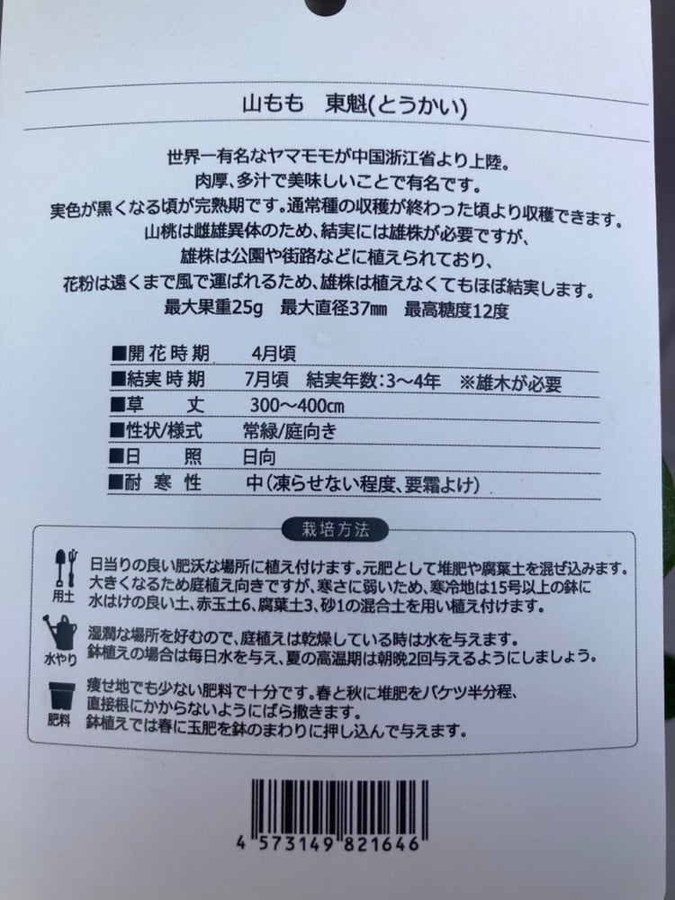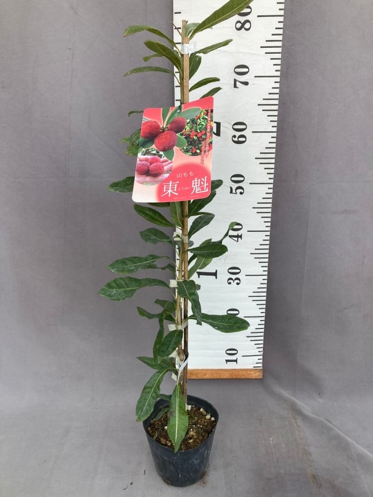 ヤマモモは果物店にはごくまれにしか登場しないフルーツですが、甘みと酸味が調和して生食でもジャムや果実酒にしてもおいしいです。年配の方には懐かしい味。葉と木姿も端正で、庭木にも向きます。東魁はピンポン玉ほどの大きさにもなる大実の品種。果重は約22~25gで糖度も高い、これから期待される高級品種です。