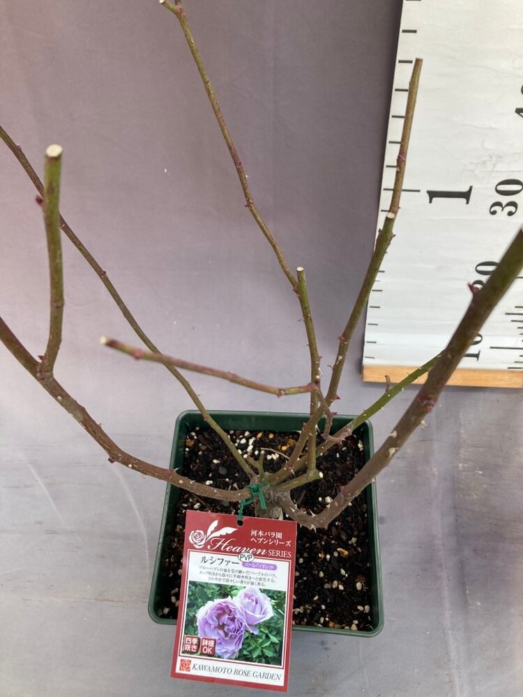 ブルーヘブンの血を受け継いだパープルのバラ。カップ咲きから徐々に半剣弁咲きへと変化する。さわやかで清々しい香りが強く香る。「光の運び手」を意味する名前で、神から最も愛された天使だったが、反逆を起こし、地獄に落とされ、悪魔の王「サタン」となる。