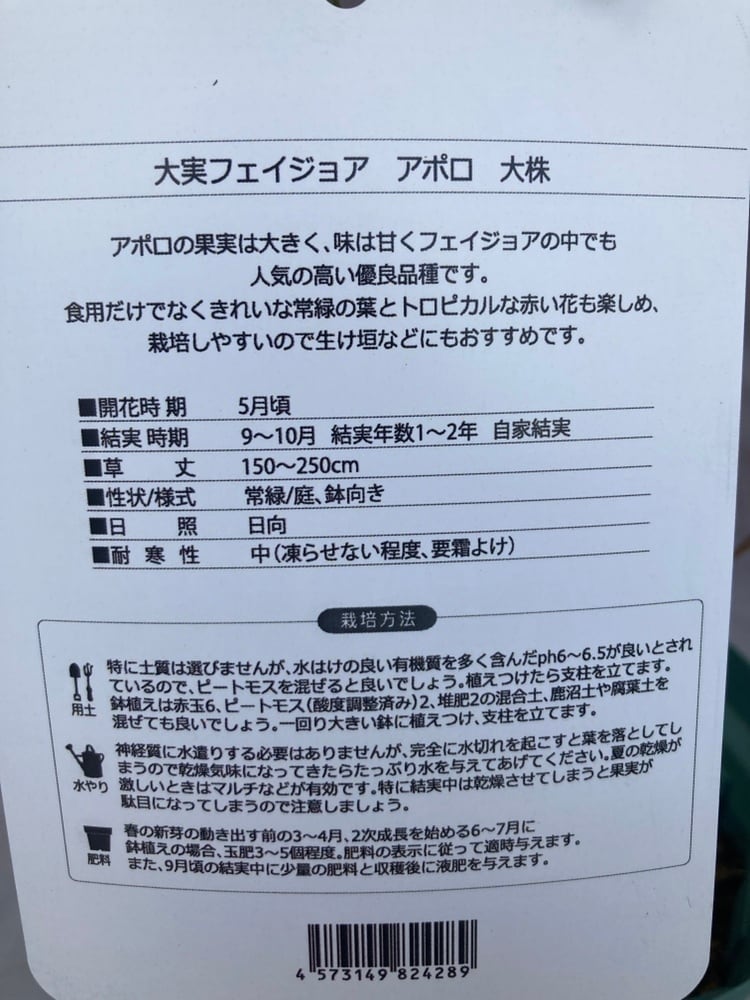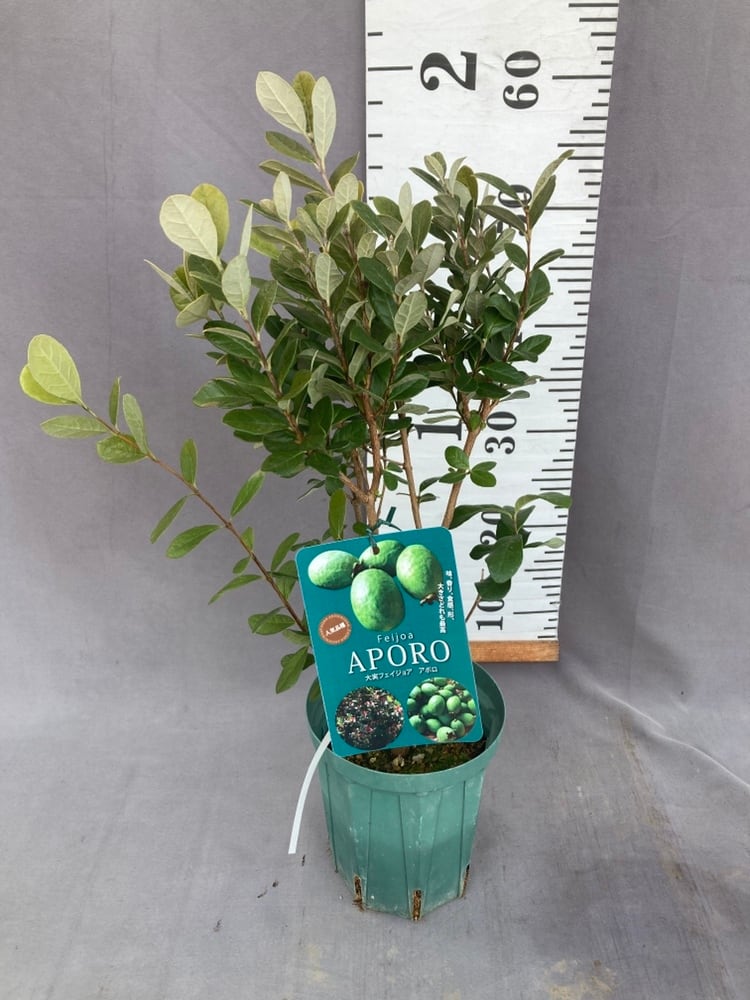 フェイジョアは、耐寒性・耐暑性とも強くどの地域で育てれる果樹の木です。アポロは1本でも結実しやすい品種です。または葉が丸く可愛いので庭木としても人気があります。果実は表面が灰緑色で、果肉は甘く芳香があります。収穫は10月ころに、熟して落ちたものを拾います。実の大きさは卵をひとまわり小さくしたくらいです。花びらも食用や、料理に添えてご利用ください。