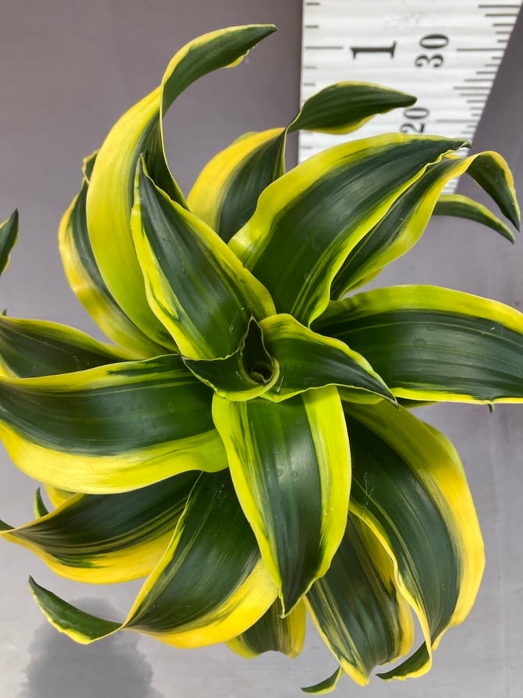 ドラセナ・コンパクタの変わり種で、名前のとおり渦を巻いたような姿が可愛らしい観葉植物です。こちらは斑入りタイプで明るい黄色のラインが入っていて爽やかな雰囲気があります。ドラセナの中でも管理が簡単な品種になります。成長も緩やかで形も乱れにくくインテリアに最適の観葉植物です。