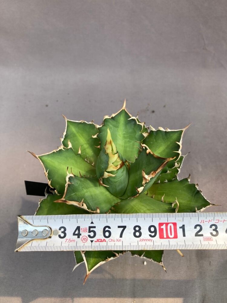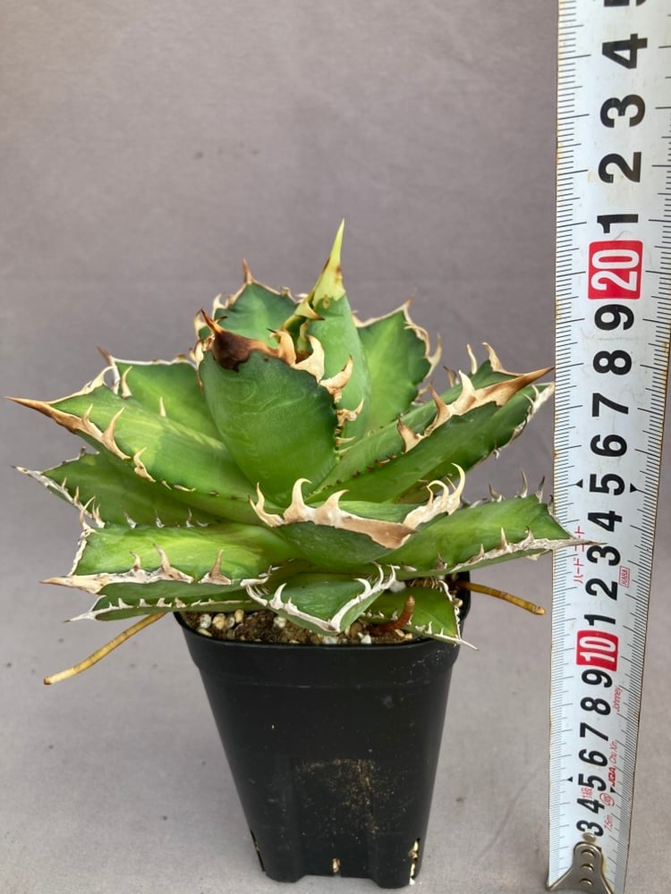 中南米原産のアガベ(リュウゼツラン)です。レッドキャットウィーゼルは少し赤みを帯びた葉に白い鋸歯が印象的なチタノタです。肉厚で幅広の白っぽい葉と、鋭いとげが特徴の品種です。ある程度耐寒性があるので、大きくなったら暖かい地域では戸外の植栽も可能です。