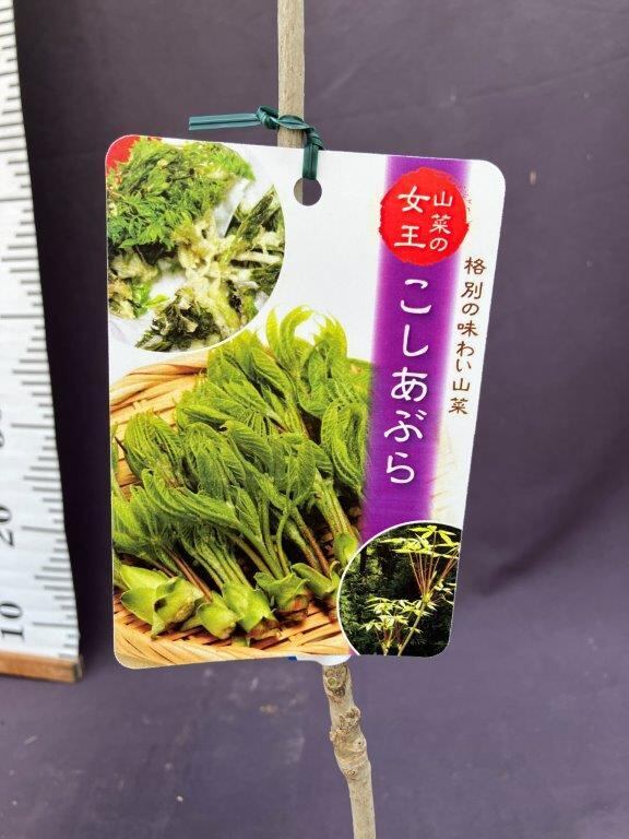 コシアブラは、北海道から九州まで自生するウコギ科の落葉高木です。山菜として人気があり、4月に出る新しい芽を付け根からもぎ取り、おひたし、てんぷらやごま和えに利用します。脂肪やたんぱく質に富み、こくのある絶品です。雑木林風の庭園樹としても好まれ、また、材は箸や楊枝などにも加工されます。冬季に畑から掘り上げて鉢上げした物なのでポットの中ではまだしっかり根が回っていませんので、ご了承ください。