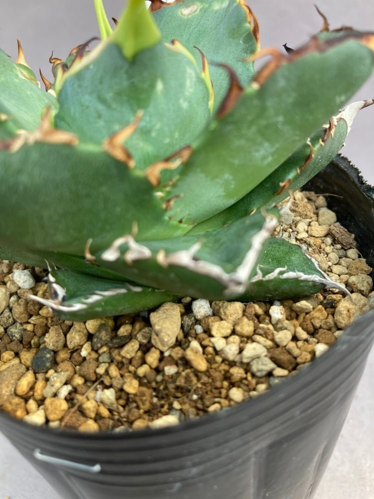 長いトップスピンと鋭い鋸歯が特徴の高級アガベ種です。成長するにつれスピンが長くうねってくることが特徴です。葉幅が広く副刺や鋸歯が薄くて平たいことが特徴です。ボール状に育て、そのボールから突き出した長い棘は圧巻。