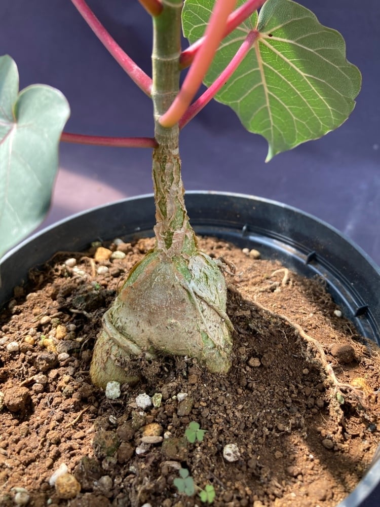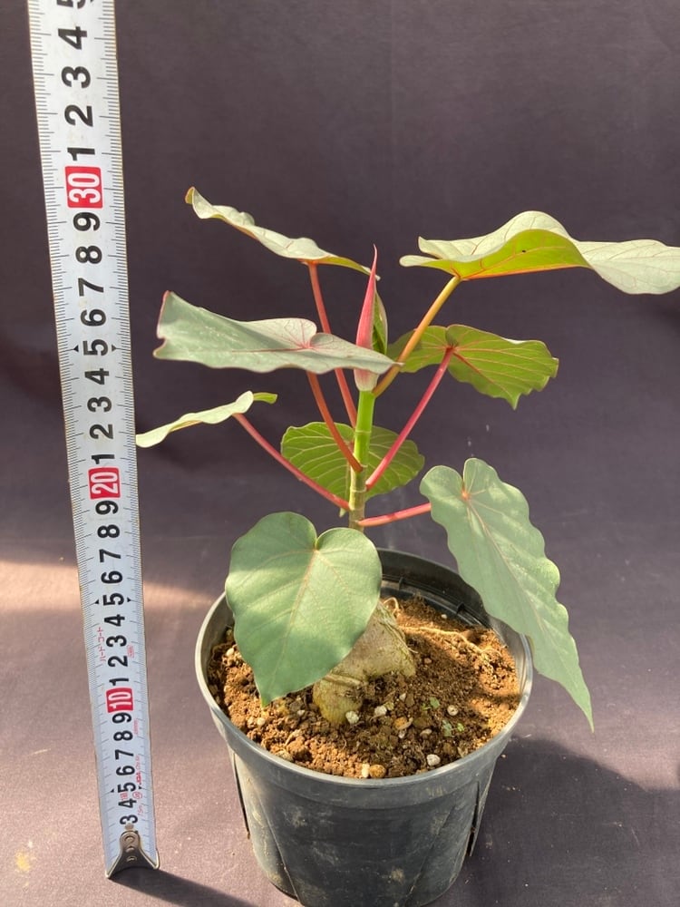 深緑に赤い葉脈が映えるゴムノキの一種。ウンベラータに似たハート型の葉から、「赤ウンベ」とも呼ばれます。フィカス属の中でもフィカスらしくない個性的な一面があり、根元の幹が塊根(かいこん)状に肥大するコーデックスプランツとなります。葉が広く展開し、葉の葉脈が赤く、茎にも赤みがあり、色彩のコントラストを楽しむことができます。