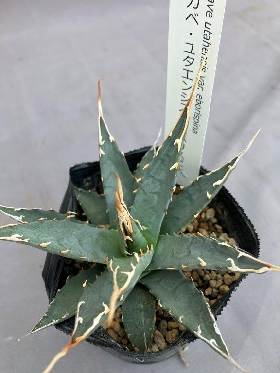 アガベ・ユタエンシス・エボリスピナは、数あるアガベの中でも最高の人気品種。アメリカのユタ州、ネバダ州、カリフォルニアに自生する。山地に小さな群れをつくり、草丈は30センチ程と小型である。葉は青灰色で、先端のアイボリー色の棘が特徴な品種。