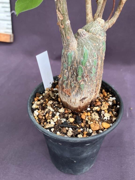 現品販売です。ボンバックスは中米、インドなどに分布する灌木で、グアテマラの国樹として知られています。性質はパキラに似ていますが、葉が幅広で根元の茎が肥大して塊根状になります。年数を経ると茎の下部が木質化して味わいのある姿になります。冬に葉を落としますが、春になるとまた美しい新芽を吹きます。生育期は夏です。