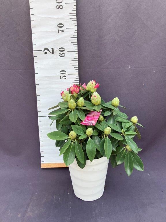 シャクナゲはツツジの仲間の常緑低木。春を告げる花木の王様と言われます。日本原産のシャクナゲが欧米で品種改良され、耐暑性が高く花色のバラエティも豊富になりました。これらは西洋シャクナゲとして鉢植え、庭園樹や公園樹として多く利用され、開花時には華やかな花が楽しめます。ユメジは早咲きの品種で鮮やかな明るいピンク色の花が印象的です。花弁の外側が濃い目のピンク、内側は淡いピンクで覆輪咲きのように見えます。豪華な大輪の花が咲きます。